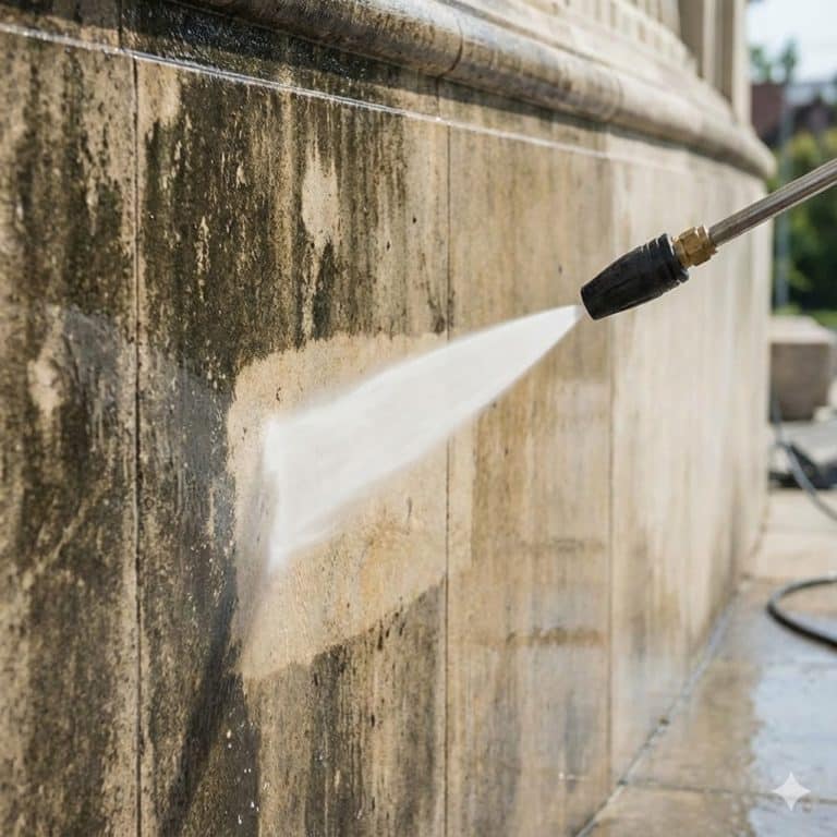 Élimination des salissures atmosphériques et pollutions par lavage basse ou haute pression, adapté à la fragilité du support (enduit, pierre).