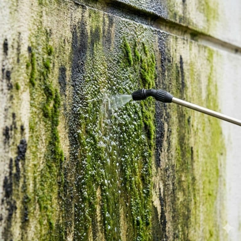 Application de solutions curatives et préventives pour assainir les murs en profondeur et stopper la prolifération des mousses, algues et lichens.