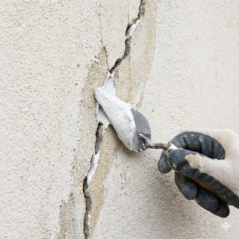 Ouverture et rebouchage des fissures et lézardes avec des enduits et mastics spécifiques pour restaurer l’étanchéité de la façade avant peinture.